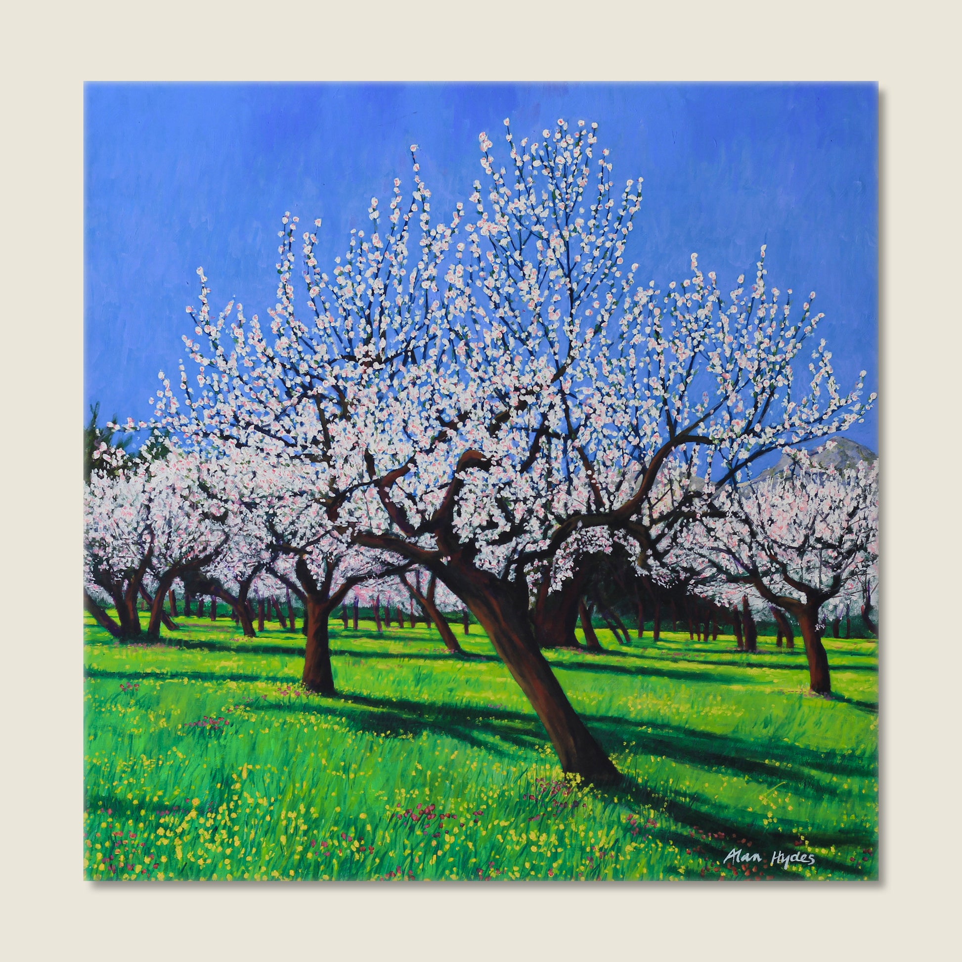 Working in the almond orchards the scent is gentle and fragrant and it only adds to the experience of painting. I even saw hares doing their Spring mating dances amongst the trees. The bright yellow flowers carpeting the ground only serves to enhance the whole colour experience."