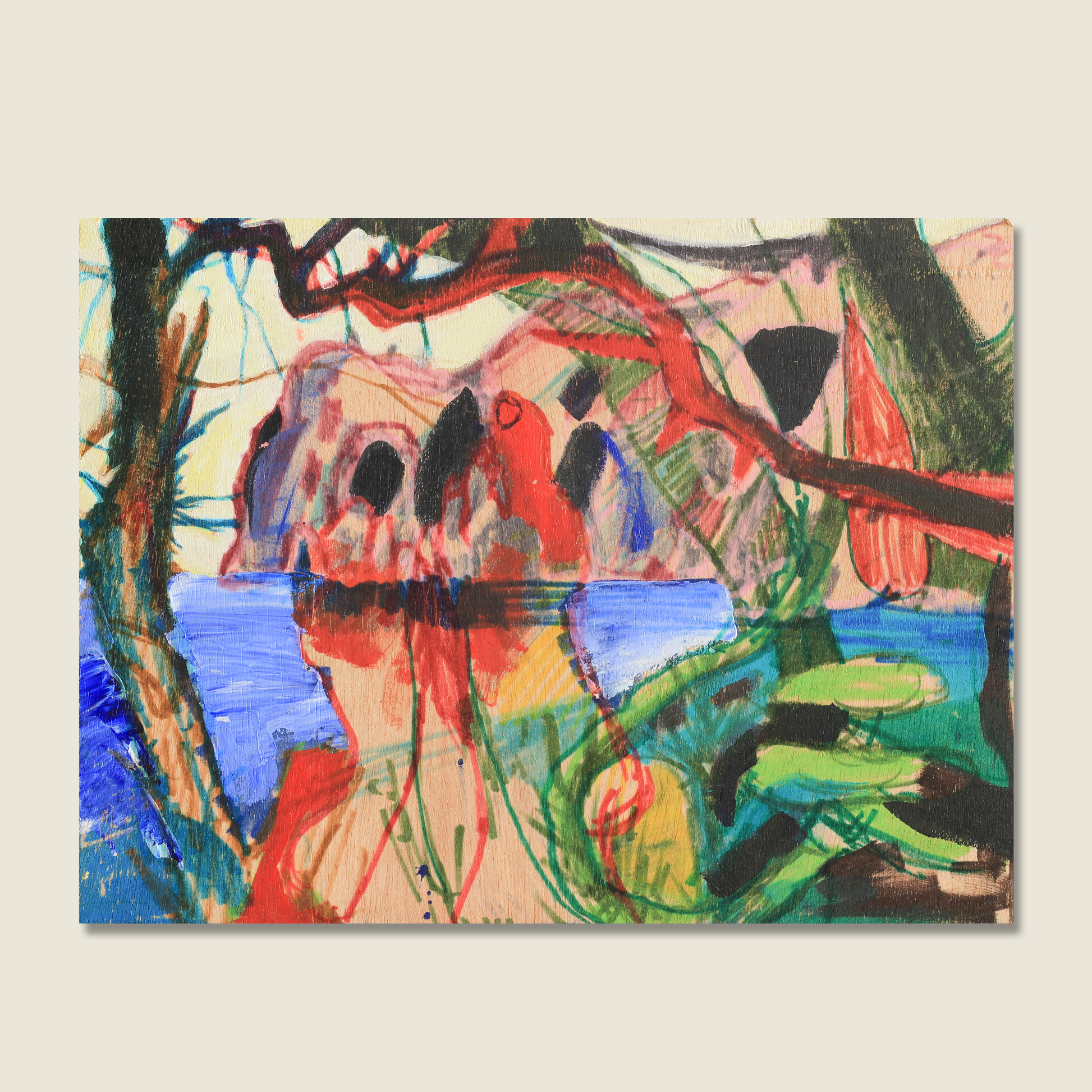"Recently I have found myself hidden in the forest somewhere along the Deia coast painting the view of the cliffs of Muleta through the trees. Transfixed for hours. Always different. Once sitting on a trunk after a long day's painting I looked up and saw two dolphins swim by. Muleta has peeked into my paintings for years and right now I am so enjoying working on this series of landscapes. It is home."
